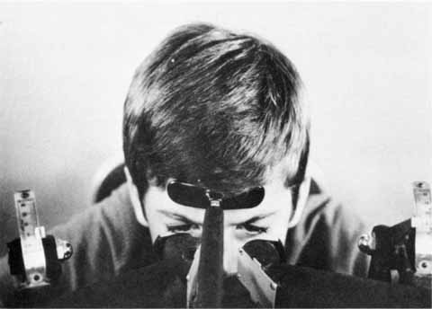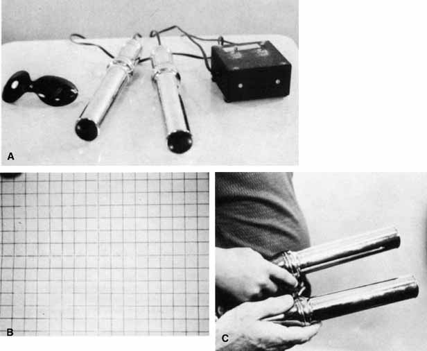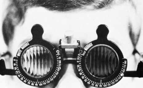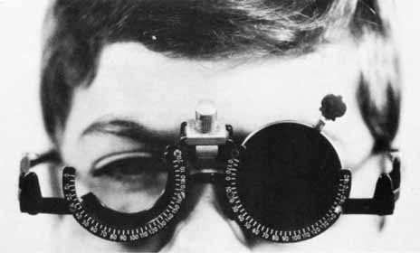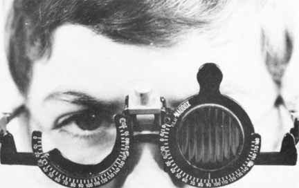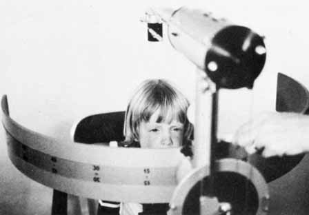 The Maddox rod test is particularly helpful in superior oblique palsy. Most commonly the paretic eye shows excyclotorsion on double Maddox rod testing, but if the patient fixates with the paretic eye, possibly the nonparetic eye will measure excyclotorsion.14 High amounts of excyclotorsion suggest bilateral superior oblique palsy. Although no absolute amount of excyclotorsion can be used to differentiate a unilateral from a bilateral superior oblique palsy, one study found a 90% probability of a superior oblique palsy being bilateral if the excyclotorsion measured in downgaze was greater than 20°.15 Mitchell and Parks16 suggested that 10° or more of excyclotorsion in the primary position was consistent with bilateral superior oblique palsy. Red Filter. While the patient fixates a small spot source of light, a red lens is placed before one of the eyes (Fig. 10). This test accomplishes the same thing as the Maddox rod in the horizontal and vertical deviations, but it is of no value in investigating cyclodeviations. It is less likely to disrupt fusion than the Maddox rod because only the color and the intensity of the images are made dissimilar whereas the contour of the images in the right and the left eye remains the same. The patient can fuse the white and the red light into a “pink” light. Prisms are used to eliminate the horizontal or vertical diplopia, yielding a direct measure of the deviation if the retinal correspondence is normal. DISSIMILAR TARGET TESTS. A number of different techniques for evaluating alignment are based on the presentation of different targets to the right and the left eye while the patient adjusts the projection device to superimpose the dissimilar images. If the retinal correspondence is normal, the point at which the images appear superimposed provides a direct reading of the patient's alignment. The two most widely used methods employing this principle are the Lancaster red-green projectors and the major amblyoscope. Lancaster Red-Green Projectors. One projector shines a red target and the other a green target on a white screen marked with a grid calibrated in prism diopters; the screen is 1 meter from the patient. The targets, of similar contour and intensity, are viewed by the patient with red-green spectacles (red filter before one eye and green before the other). The patient adjusts the targets so they appear superimposed (Fig. 11), thus affording a direct reading of any deviation. Horizontal, vertical, and torsional deviations are well revealed because the targets are linear, 2 to 3 cm in length.17 Major Amblyoscope. The patient views the dissimilar targets, which are simultaneously deposited in the housing of each tube, and adjusts them so that the images (e.g., bird and cage, car and garage, fish and bowl) are superimposed (Fig. 5, 6, and 7A). If the retinal correspondence is normal, the horizontal, vertical, and torsional deviations are read directly from the scales on the instrument that records the deflections of the tubes away from zero in these three planes. Furthermore, the illumination of the tubes can be alternately flashed on and off, allowing only one eye to view the target at a time. By observing the movement of the eyes as they fixate first one and then the other target, the examiner can adjust the tubes to eliminate all movement (Fig. 12). This, in effect, is an alternate cover test; however, instead of using prisms to measure the quantity of deviation, it is recorded by the scales on the instrument. With the exception of testing methods using the major amblyoscope, primary position alignment may be investigated either while the head is erect or when it is tilted to either shoulder. The purpose of testing the alignment in the primary position with the head tilted is to study the effect of the utricular reflex in cyclovertical muscle deviations. The head is rotated about the coronal axis for 60° toward either shoulder, and the alignment is checked by cover tests, corneal reflex tests, dissimilar image tests, or the Lancaster red-green projectors. |