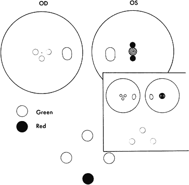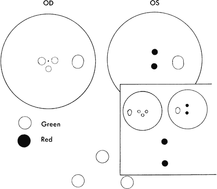 Strabismic patients who acquire deviation of 10Δ or more after having developed normal binocular vision reflexes have diplopic and visual confusion symptoms until extramacular binocular vision reflex converts from NRC to ARC. While still in NRC mode, the response to the Worth dot test is five lights (two red and three green). The dots seen by the fixating eye are clear, whereas those seen by the deviating eye are blurred. The blurred dots are projected in space opposite the direction of the deviated eye, causing homonymous diplopia in esotropia, heteronymous diplopia in exotropia. The dots seen by the hypertropic eye appear lower; those seen by the hypotropic eye appear higher. The image in the intorted eye appears extorted; that in the extorted eye appears intorted. Horizontal or vertical diplopia can be eliminated by the appropriate prism or prisms placed before the strabismic eyes but there is no prism correction that eliminates the torsional diplopia. As the ARC fusion mode gradually replaces the NRC fusion mode, the Worth-dot response becomes four lights—despite strabismic deviation. The projection angle on the cluster of dots, however, must exceed the size of the suppression scotoma that always accompanies ARC. The suppression scotoma is 5° or more in esotropia (Fig. 3) but larger in exotropia.