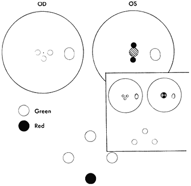 Patients with esotropia of 10Δ or more give varied responses, depending on whether they have NRC or ARC monocular vision or an absence of binocular vision. The NRC esotropic patient sees two fixation lights in homonymous diplopia, with a separate streak through each and without a break in either streak. Compensating for the esotropic angle with base-out prisms eliminates the diplopic fixation light, and the streaks then intersect at the fixation light. The patient with ARC and suppression sees one fixation light and two streaks forming an X; after questioning, the patient recognizes the suppression scotoma projecting from the nasal retina of the deviated eye as a gap of 5° to 6° around the fixation light in the streak seen by that eye (Fig. 7). The scotoma can be further studied by removing the striated glass from in front of the fixating eye and slowly rotating the striated glass before the nonfixating eye (Fig. 8). As the streak rotates, the gap in the streak around the fixation light persists, beautifully outlining the scotoma for 360°. Furthermore, ARC is made evident by the patient's claim that the streak seen by the deviated eye passes through the fixation light as the patient mentally connects the two ends of the gap in this streak. When the light is held in front of the eyes, base-out prism power equal to the esotropic deviation produces crossed diplopia for the fixation light, and each light has its separate streak passing through it. The patient devoid of single binocular vision sees only one light and one streak (Fig. 9). The patient may claim to see two streaks if rapidly alternating but will admit under questioning that they are not perceived simultaneously.