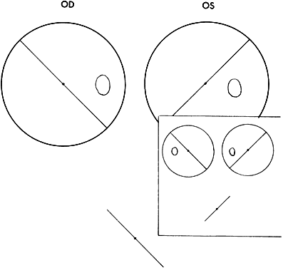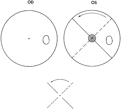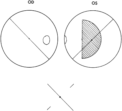 The patient with exotropia of 10Δ or more may report NRC with heteronymous diplopia, ARC with suppression, or an absence of binocular vision. The large profound scotoma of the temporal retina, extending up to the hemiretinal line in the exotropic patient with ARC, prevents all but the best observers from appreciating the extremely peripheral small streak seen outside the suppression scotoma of the deviated eye (Fig. 10); consequently, many exotropic patients report seeing only one streak. Those who can detect the small peripheral ends of the streak describe the ends on the axis that coincides with the light, supporting the diagnosis of ARC. Furthermore, base-in prism power placed in front of the eyes that equals the deviation angle creates homonymous diplopia of the fixation light, each image having a separate streak.