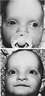 Fig. 1. A. A 3-month-old child with congenital exotropia. left exotropia = 55 degrees. B. The same child at 13 months of age has straight eyes 7 months after recession of the lateral rectus muscles, both eyes.