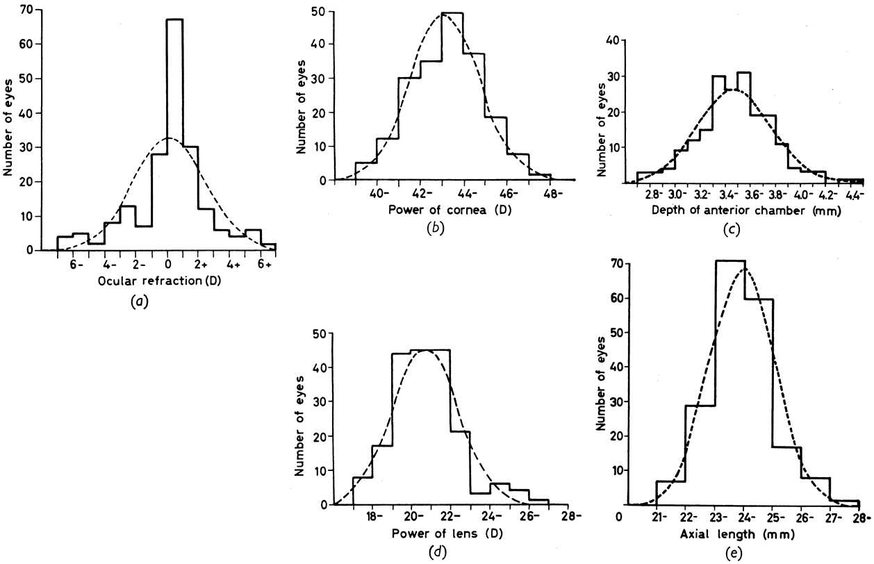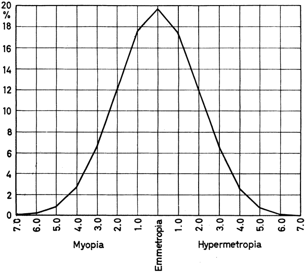 The rather simple scheme postulated by Steiger is no longer tenable, as it led to a theoretically normal distribution of refractive error (Fig. 2), but his seminal work is the starting point of current ideas about the ocular components and refractive error. Current views are based on knowledge of the distribution of the refractive error in the general population and on the measurement of the various individual components of refraction (corneal power, anterior chamber, crystalline lens anterior and posterior surface curvature and thickness, vitreous chamber depth, and axial length). |