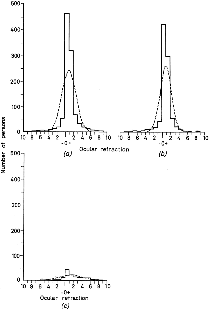 service recruits is depicted in Figure 3 (1033 men).7 No comparable curves are available for women. There are significant deviations from a normal distribution in Figure 3. The peak of the distribution is at approximately +1.00 D of hyperopia and represents a disproportionate number of people with low hyperopia (leptokurtosis). Moderate myopia and hyperopia are underrepresented in the actual data relative to the theoretic normal distribution, and high myopia and hyperopia are overrepresented. In this general population (as shown in Fig. 3), a high proportion has no refractive error by any practical definition. Seventy-five percent of the sample of national service recruits had refractive error between 0.00 and +1.90 D. The considerable excess of emmetropic and nearly emmetropic refractions in Figure 3 and in other samples excludes the possibility that such refractions are the result of a random combination of components of refraction, whereas the probable excess of high myopes and high hyperopes suggests that these fall outside the mechanism that produces coordinated emmetropic and nearly emmetropic eyes. |