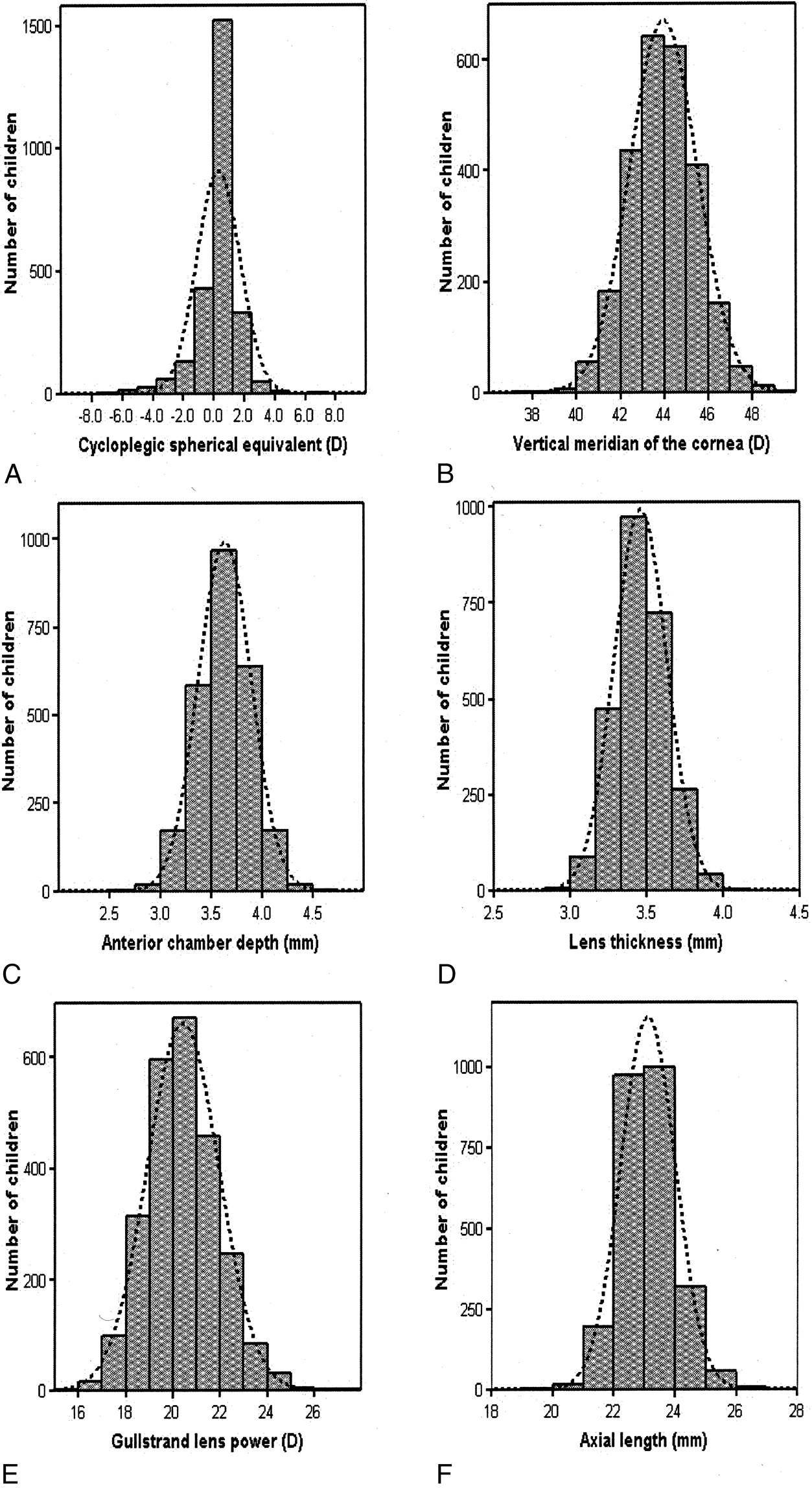 NORMAL DISTRIBUTION AND AGE/GENDER EFFECTS IN CHILDHOOD Figure 4 from Sorsby's original work2 shows that although refractive error was not normally distributed but followed the pattern seen in Figure 3, all the individual components were normally distributed. The data in Figure 4 depict the distribution of the components in adults; axial length was calculated from the other variables. The Orinda Longitudinal Study of Myopia,8 now continuing as the Collaborative Longitudinal Evaluation of Ethnicity and Refractive Error (CLEERE) Study,9 is the first study to measure all the ocular components in school-aged children. Figure 5 depicts the distribution of the ocular components, and Table 1 describes these data as a function of age and gender.