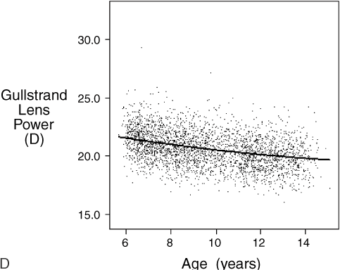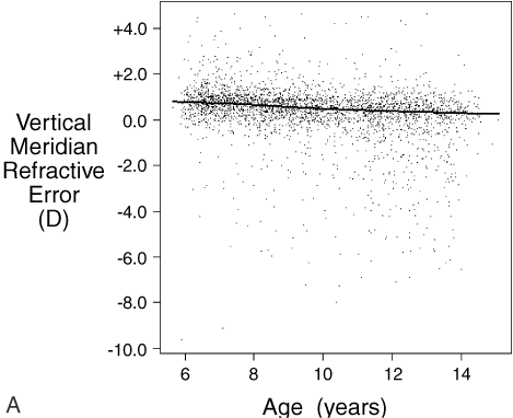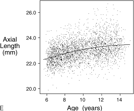 SLOW JUVENILE PHASE OF OCULAR GROWTH Figure 7 shows ocular component data collected from children enrolled in the Orinda Longitudinal Study of Myopia between 1989 and 1993 as a function of age. Refractive error in the vertical meridian declines, on average, from low hyperopia toward emmetropia with increasing age (Fig. 7A), with the typical distribution, leptokurtic for near emmetropia and more myopes than hyperopes, evident. The summary curve for central corneal curvature in the vertical meridian shows no effect with age (Fig. 7B). The previously reported thinning of the crystalline lens between the ages of 6 and 9 years21 is evident in Figure 7C. Figure 7D shows the typical decrease in crystalline lens power occurring during school ages, presumably to compensate for the axial length increases that occur concurrently (Figure 7E). It is when the thinning and flattening of the crystalline lens are outpaced by excessive or anomalous axial elongation during this slow phase of ocular growth that myopia occurs. |
