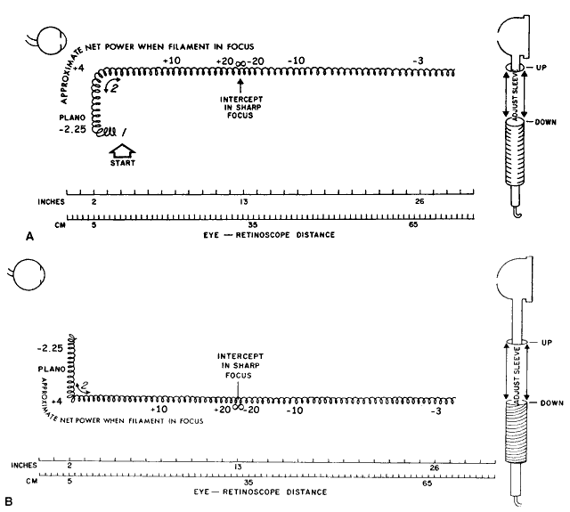 *Can also be used for estimation of eyes whose net refractive errors are between 1.50 to 3.00. †For retinoscopes whose beam diverges with sleeve down.
