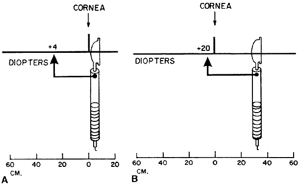 The reader must understand four specific differences between the performance of ophthalmoscopic retinoscopy and neutralization retinoscopy. First, during ophthalmoscopic retinoscopy, the working distance starts at 5 cm from the patient and ends at 66 cm, whereas the working distance remains at 66 cm for neutralization retinoscopy (Fig. 6). Second, the sleeve is “spiraled” up during ophthalmoscopic retinoscopy—it is rotated while it is raised from the sleeve down to the sleeve up position, whereas for neutralization retinoscopy, it is left in the sleeve down position and swept from side to side across the pupil. Third, no lenses are used during initial ophthalmoscopic retinoscopy, but they are almost always used during neutralization retinoscopy. Fourth, the end point for ophthalmoscopic retinoscopy is a clear, sharp “ophthalmoscopic” image of the retinoscope streak, whereas for neutralization retinoscopy the end point is the neutralization reflex where the pupil immediately fills with an unfocused image of the streak. The basic idea behind ophthalmoscopic retinoscopy is that the retinoscopist can determine when the focal point of the retinoscope falls on the focal point of the patient's eye. When this occurs, the retinoscopist can see the image of the retinoscope streak as a sharply focused line in the patient's pupil. By altering both the distance of the retinoscope to the patient's eye and position of the focal point of the emitted streak from the retinoscope head (which is another way of saying the “vergence” of the emitted streak), the retinoscopist can superimpose the focal point of the retinoscope onto the focal point of the patient. OPHTHALMOSCOPIC RETINOSCOPY OF SPHERICAL EYES When performing ophthalmoscopic retinoscopy, the retinoscopist begins with the retinoscope 5 cm (about 2 inches) away from the patient's eye with the sleeve all the way down (Fig. 7). The streak exits the retinoscope head as diverging light that comes to focus at a distance 40 cm behind it (behind the retinoscopist's head) in virtual space. If the patient is a -2.25 D myope, the focal point of the retinoscope lies in the same point in space as the focal point of the patient, and the retinoscopist sees a finely focused streak of light in the patient's pupil. It does not matter that the focal point of the retinoscope is in virtual space; it only matters that the focal point of the retinoscope is coincident with the focal point of the patient. At this point, the patient's and retinoscope's focal points are conjugate. The retinoscopist now rotates the streak 360 degrees by rotating the sleeve in the retinoscope handle. If the streak image is in focus in all meridians, the patient has no astigmatism, and ophthalmoscopic retinoscopy is complete at this stage. However, if the streak is in sharp focus in one orientation, but out of focus in another, the patient has astigmatism. Estimation of the refractive errors of astigmatic individuals is discussed toward the end of this section. For now, let us concentrate on eyes with spherical refractive errors. Emmetropia and Mild Ametropia If the patient's refractive error is anything other than -2.50 D, the image of the streak in his pupil as seen by the retinoscopist will be out of focus—the farther the patient is from -2.50 D, the more out of focus the image will be. At this point, the retinoscopist slowly raises the retinoscope sleeve while rotating the streak 360 degrees (a technique known as “spiraling”). She keeps the retinoscope head 5 cm from the patient's eye throughout this step. As the sleeve is raised the first one third of its range, the focal point of the retinoscope moves farther and farther from the back of the retinoscopist's head until it lies on the horizon when the sleeve is approaching one third of the way up. If the image of the streak is in focus at this point, the patient's focal point must lie at infinity, and he must therefore be emmetropic (Fig. 8). All patients with refractive errors between emmetropia and 2.25 D of myopia should be discovered up to this point with the sleeve between all the way down and one third of the way up, with the retinoscope positioned 5 cm from the patient. The retinoscopist can easily learn to calibrate the sleeve position for the vergence and refraction at the 5-cm distance and depend on proprioception and a memorized calibration scale for this information. The mechanics of most retinoscopes make it difficult to permanently display this information on the handle. Fortunately, it is possible to place a written calibration on the handle of the Heine ophthalmoscope so that the 5-cm ophthalmic retinoscopy can be read with precision (see Fig. 5). The text in the preceding section explains how to calibrate any retinoscope, and the exercise can help you understand the optics. If the retinoscopist gets much above the midsleeve position with the streak not yet coming into focus, she continues to spiral the sleeve up. She is now in the area where the image of the streak of patients with low hyperopic refractive errors will appear in focus. This occurs because the streak is emitted in a converging nature when the sleeve is raised above the one-third mark. The focal point of the streak is now located in space behind the patient's head. When the sleeve is just barely above one third of the way up, the focal point of the streak is far behind the patient's head, near the horizon, and will be conjugate with the patient's focal point only if he is a weak hyperope (Fig. 9). As the sleeve is raised farther, the focal point of the retinoscope moves closer to the back of the patient's head. When the sleeve is raised all the way up, the focal point of the retinoscope lies 33 cm in front of it—roughly 25 cm behind the patient's cornea. The focal point of the retinoscope will be conjugate with the focal point of the patient if he is a + 4 hyperope. All hyperopes with refractive errors lower than + 4 should be discovered
