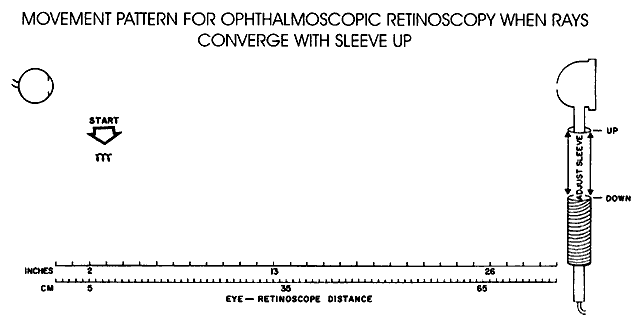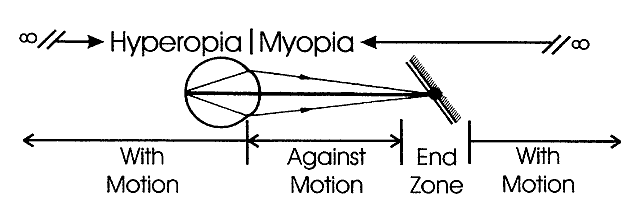 present spectacles. Neutralization is performed with the retinoscope held at a constant predetermined distance from the patient with the sleeve all the way down (light emitted in a diverging manner). The retinoscopist makes decisions about the patient's refractive error based on the appearance of the retinoscope reflex after it is reflected off the patient's fundus and back through the pupil (Fig. 16). What the retinoscopist sees is not the image “on the retina” (which is what she sees when performing ophthalmoscopic retinoscopy), but rather the magnified image “of the retina.” Therefore, discussion about neutralization retinoscopy must begin with discussion about the retinoscopic reflex at neutralization. THE NEUTRALIZATION REFLEX When performing neutralization retinoscopy, the retinoscopist shines diverging light through the patient's pupil from a standard working distance (usually 66 cm). This light is reflected off the patient's fundus, and in this way, the fundus acts as a new point source of light. This is called the illuminating system. The light that originates from the luminous retina then passes through the patient's vitreous, lens, pupil, aqueous, and cornea, until it finally exits the patient's eye on its way back to the retinoscope. This is called the viewing system. The retinoscopist must be able to differentiate between the illuminating and viewing systems because different techniques of retinoscopy can depend on varying the components of one but not the other. For example, ophthalmoscopic retinoscopy, as described previously, allows the user to vary different aspects of the illuminating system while keeping the viewing system constant. Neutralization retinoscopy, conversely, varies the viewing system while keeping the illumination system constant. When diverging light is shone onto an emmetrope's retina, the retina becomes luminous and acts as a point source of light. The rays of light then escape his eye in a parallel fashion. If this concept is not intuitive, merely follow the standard light ray diagram backward. In similar fashion, light starting as a point on a myope's luminous retina is emitted as converging light, where more myopic individuals emit more highly converging light than less myopic ones. Similarly, light starting as a point on a hyperope's luminous retina is emitted as diverging light, and hyperopic patients emit more diverging light than less hyperopic ones. The vergence of the rays emitted from the eye determines the qualities of the reflex seen by the retinoscopist. A neutralization reflex occurs under the circumstance when the far point of the eye correlates with the location of the peephole of the retinoscope (Fig. 17). If a retinoscopist were to examine an emmetropic eye at infinity, she could make assumptions on the diverging, converging, or parallel nature of the reflected light by sweeping the retinoscope streak back and forth across the patient's pupil. However, it is not possible to perform retinoscopy from an infinite distance; it is customary to adapt a working distance of 66 cm, corresponding to + 1.50 D. By introducing + 1.5 lens in front of the subject's eye, the far point of a plano prescription is relocated to 66 cm (correcting the final prescription for the working distance lens is described subsequently). In this circumstance, what the retinoscopist is truly evaluating is whether the retinoscope lies between the patient's eye and far point, lies at the far point, or lies beyond it. If the patient is an emmetrope, the far point lies on the horizon, and therefore the retinoscope always must lie between the patient's eye and far point. If the patient is a hyperope, the far point actually lies beyond the horizon, and the retinoscope also lies between the patient's eye and far point. Things are more interesting, however, when evaluating myopes in this way. Light is emitted from a myope in a converging manner so that the far point is somewhere in real space in front of the myope's eye. It is possible for the retinoscope to be placed between the patient and far point, exactly on the far point, or out beyond the far point. This relationship depends, of course, on both the location of the retinoscope, and the level of myopia (which determines the location of the far point). If the retinoscope is placed between the eye and far point (as it is for all emmetropes and hyperopes, and some myopes) and turned so that the emitted streak is swept from side to side across the patient's pupil, the light reflex seen inside the pupil appears to sweep in the same direction as the light emitted from the retinoscope (seen on the patient's iris, lids, brow, and cheek). This motion is called “with” motion because the light that is afferent to the retinoscope seems to move “with” the light that is efferent from the retinoscope (Fig 18). If the retinoscope is placed beyond the patient's far point and swept from side to side across the pupil, the light reflex seen inside the pupil appears to sweep in the opposite direction as the streak emitted from the retinoscope (Fig. 19). This motion is called “against” motion because the light emitted from the eye appears to move “against” the light that is emitted directly from the retinoscope.