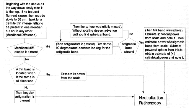 A sometimes useful and interesting phenomenon occurs when the converged beam is focused close to the plane of the cornea and lens of the subject's eye; it is a diffuse red reflex that may retroilluminate anterior segment opacification. The red reflex when the intercept is focused on lens of the eye is called the “incidence neutral” point in retinoscopy.11 If the retinoscopist has gone this far in the process of ophthalmoscopic retinoscopy and the image of the retinoscope streak has not yet come into focus, she merely continues to move farther from the patient. In this way, she moves the focal point of the retinoscope through the range where the focal points of the high and mid-range myopes lie. Eventually, she will pull the retinoscope back to the point where it is 66 cm away from the patient's eye. Here, with the retinoscope sleeve all the way up, the focal point of the retinoscope lies 33 cm in front of it and 33 cm in front of the patient. Therefore, at arm's length, the focal point of the retinoscope is conjugate with the focal point of the patient if he is a -3 myope. Through ophthalmoscopic retinoscopy, all ranges of myopia and hyperopia can be deduced unless the patient's refractive error lies between -2.25 and -3.00 D. The focal points of these moderately myopic patients fall outside of the range accessible to the streak retinoscope using ophthalmoscopic retinoscopy without a trial lens. Ophthalmoscopic Retinoscopy of Highly Ametropic Eyes Ophthalmoscopic retinoscopy reveals a focused streak image very near the intercept point in all high myopes and high hyperopes. The conjugate point for high hyperopes lies just inside of the intercept point and for high myopes lies just beyond it. Certain techniques exist to help fine-tune the end point. When the ophthalmoscopic retinoscopy end point lies near the intercept point, the retinoscopist can return the retinoscope to the point in space where the intercept point is seen. She can then keep her free hand at this point in space and move the retinoscope in (for hyperopes) or out (for myopes) until the end point is seen. She then merely needs to measure the distance between the retinoscope and her free hand and convert that distance to diopters. If she had to move the retinoscope forward 10 cm, she knows that the patient is a + 10.00-D hyperope; if she had to move the retinoscope backward 5 cm, she knows that the patient is a -20.00-D myope. Although ophthalmoscopic retinoscopy is typically performed without lenses, loose lenses can also be used to help refine the estimated end point of a patient with a high degree of ametropia. For example, take the situation where the image of the streak is in sharp focus when the retinoscope is held 36 cm away from the patient's eye. This is the range at which focal points can be found for high myopes; however, the distance separating the focal points for all those between -8 and -20.00 D is fairly small. In fact, focal points for this range of myopia span an area only 7.5 cm wide. In this situation, it is helpful to put up a -10.00-D lens and repeat all the steps of ophthalmoscopic retinoscopy. Now, suddenly, the -8.00-D patient will behave much differently than a -14.00-D patient: the -8.00-D patient will appear like a + 2.00-D hyperope, and the -14.00-D patient will appear like a -4.00-D myope. In this way, a much truer estimation of the patient's refractive error can be made. This same technique, of course, works equally well for high hyperopes and aphakic individuals. The only difference is that the retinoscopist holds a + 10.00-D lens rather than a -10.00-D lens. OPHTHALMOSCOPIC RETINOSCOPY OF ASTIGMATIC EYES Detection The previous discussion describes the technique for ophthalmoscopic retinoscopy of patients with spherical refractive errors. When estimating astigmatic individuals, an extra step must be taken. Unlike someone with a spherical refractive error who focuses light to a point a single discreet distance from his pupil, a patient with regular astigmatism focuses light to two points (actually lines), located two discreet distances from his pupil. Through this technique of ophthalmoscopic retinoscopy, it is easy for the retinoscopist to find these two focal distances. The key to discovering astigmatism by ophthalmoscopic retinoscopy is that the retinoscopist constantly rotates the streak by rotating the sleeve in the retinoscope handle. During the first stage of ophthalmoscopic retinoscopy, while the sleeve is being raised, it is also being rotated—the two motions combined result in spiraling. During the later stages of ophthalmoscopic retinoscopy, while the sleeve is kept in the “sleeve up” position, it is rotated while the retinoscopist moves the retinoscope from 5 to 66 cm away from the patient's eye. For a patient with astigmatism, ophthalmoscopic retinoscopy is begun just as it is with a patient with a spherical refractive error. The retinoscope is placed 5 cm in front of the patient's eye with the sleeve all the way down (Fig. 14). The retinoscopist then rotates the streak without raising the retinoscope sleeve. Any irregularity in the width of the reflex indicates regular or irregular astigmatism. This step is referred to as Step 1 of ophthalmoscopic retinoscopy because it is such a helpful first step. Everything else that had been discussed in the previous section is referred to as Step 2 and is shown in a flowchart (Fig. 15). The retinoscopist slowly spirals the sleeve up while evaluating the appearance of the image of the streak in the patient's pupil. At some point, the image of the streak should be in sharp focus. Without lowering or raising the sleeve, the retinoscopist rotates it 360 degrees. If the image of the streak stays in sharp focus, that patient does not have astigmatism; the retinoscopist makes note of the sleeve position and distance from the patient, and ophthalmoscopic retinoscopy is complete. If, however, the image of the streak goes out of focus while t