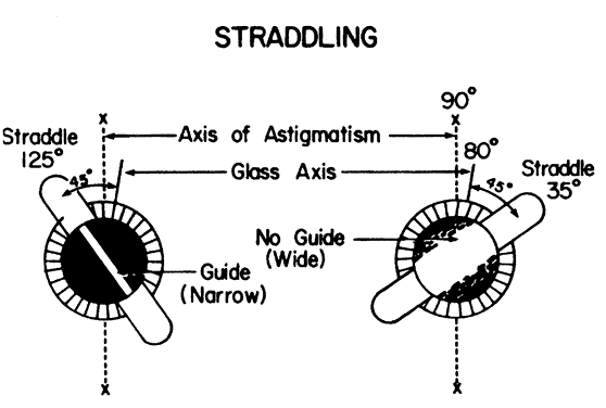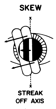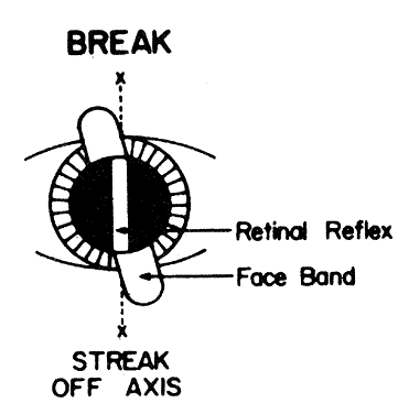 The Skew Phenomenon: An Optical Illusion Michaels2 has explained as an optical illusion the oblique motion seen in astigmatism that prompted the development of retinoscopy. Try the experiment he proposed. Observe a pencil held at 45 degrees through a 2.5-cm hole in a piece of paper held 25 cm from your eye. Sweep the pencil horizontally behind the hole and observe that the pencil seems to move obliquely. The oblique reflex motions and the break phenomenon observed in astigmatism as a consequence of the “conoid of Sturm.” The magnification of the retinal reflex varies in each meridian. Only when the retinal reflex and the intercept are aligned do they form an unbroken line. Movement of the streak along any other meridian produces an oblique reflex motion. |