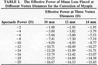 permit a more realistic expectation of their vision with, stronger spectacles. The minus spectacle lens operates at an optical disadvantage when compared with the plus lens, and this is increasingly so with higher degrees of refractive error. As can be seen in Table 1, a minus lens requires substantially greater power to correct a given refractive error than would a plus lens at the same vertex distance. Image minification also becomes more marked with greater lens powers of myopic correction and with increases in lens vertex distance.
