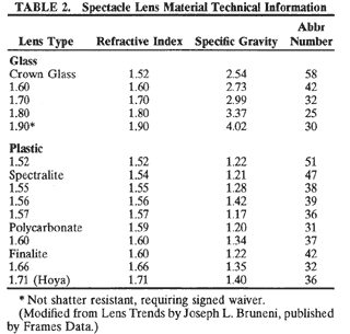 the base-down prism of the minus carrier lens. Another problem encountered in high anisometropic myopia is that of unequal image minification by the correcting lenses. This can result in sizable amounts of aniseikonia, which can adversely affect binocular vision. Changes in base curve, thickness, and vertex distance of the spectacle lenses can be made to compensate for some of the difference in image size between the two eyes. Contact lenses are the best solution if they can be worn, as they result in the greatest reduction of image size disparity between the two eyes. Because most patients have this problem from birth, neurophysiologic adaptive processes usually facilitate wearing spectacles asymptomatically if they are provided at an early age. Patients who suddenly have a substantial change develop in their spectacle correction, such as from retinal detachment surgery or asymmetric progression of myopia, usually become symptomatic because of aniseikonia. These cases require special consideration when dispensing new spectacles. The ability of many patients, notably children, to fuse in the presence of high degrees of myopic anisometropia may be attributed to “Knapp's rule,” which holds that in axial myopia, correcting lenses placed at the anterior focal plane of the eye produce no change in retinal image size (Fig. 8).9 Regardless of the reason offered, many patients with anisometropic myopia exhibit some grade of fusion while wearing spectacles. It should be clear from all of the forgoing that myopes, especially those with higher errors, need special attention to detail in the selection and fitting of their correcting spectacles. In addition to recording the vertex distance of refraction and the notation of the need for slab-off bifocals, the ophthalmologist should take a moment to advise the patient regarding the choices now available regarding spectacle frame styles and lens types. For example, the patient should know that large frames require large-diameter lenses, which are thicker and heavier, more subject to warpage, and more apt to be dispensed with incorrect lens centration. The thick edges of high minus lenses can be camouflaged to some degree by tinting the lens edges the same color as the frame. Placing the lens further back in the frame by advancing its bevel also is effective in this regard. The use of newer high refractive index lens materials (Table 2) as well as aspheric lens designs allows for more than a 40% reduction in edge thickness and overall weight. Cost may be the only restraint keeping these lenses from being the only ones available on the market today.