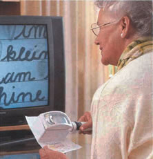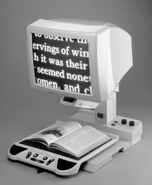 A mini, desktop-style, portable video magnifier is available for reading and writing and weighs less than 3 pounds. Much like the conventional CCTV, this lightweight system has a magnification range of 4× to 50× and connects to most television sets and computer monitors (Freedom Vision, Mountain View, CA). |
