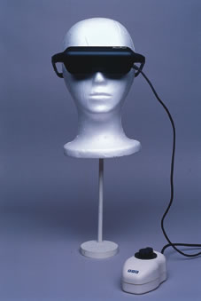 For distance viewing, a head-mounted camera system is available with an autofocus magnification range of up to 25×. The system has been updated to provide a more lightweight and compact design with a portable battery pack. The zoom feature and autofocus capability assists in discerning details with greater ease (Fig. 7) (Enhanced Vision Systems, Huntington Beach, CA). The head-mounted design enables hands-free use. The autofocus feature allows a wide range of viewing distances. Contrast enhancement and reversal permit individuals to select optimal images for different tasks. Automatic video gain control and maintenance of constant screen luminance are functions of particular benefit to patients with adaptation/glare difficulties. Finally, the system allows for binocular viewing and the possibility for a wider field of view. Disadvantages include weight, appearance, cost, complexity of operation, and potential problems of motion sickness and claustrophobia. When viewing through a magnifying system, retinal image motion is magnified, and the visual vestibulo-ocular reflex gain must be equal to the magnification to stabilize the retinal image. The systems are unsuitable for patients with serious hand/head tremors or patients who are physically unable to operate the controls or support the headset.29