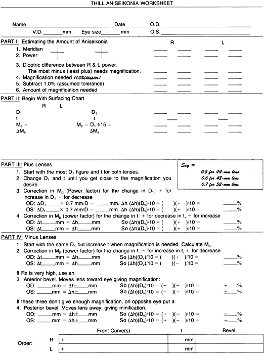 Consider the possibility of aniseikonia in a patient with anisometropia. Check carefully for symptoms of asthenopia, photophobia, and headaches. Note difference in corneal power and axial length, and look for beginning cataract. A binocular problem may be suspected if occluding one eye results in elimination of symptoms. A clip-on aniseikonic correction can be tried. Sometimes simply ordering equal base curves and center thicknesses and using minus cylinder will solve the problem. If a more sophisticated solution is desired, start by putting the prescription on an optical cross to compare on meridian with the other. Use a chart that you can get from your laboratory to see how the lens would usually be designed in stock form. Using this as a starting point, plan changes remembering that you can minify the image from one lens as well as magnify the image from the other, or both. Be careful not to design a lens that is impractical optically or cosmetically. A zyl frame will hide the edges of the lenses better than a metal frame, and use a frame with the smallest eye size possible so that the weight factor will be minimized. Make lenses in plastic when possible. Remember that your patient must accept the appearance of the finished product. It may be advisable to change the dioptric power or the axis a slight amount and thereby sacrifice some visual acuity rather than to use a lens that is too thick or too heavy to wear.