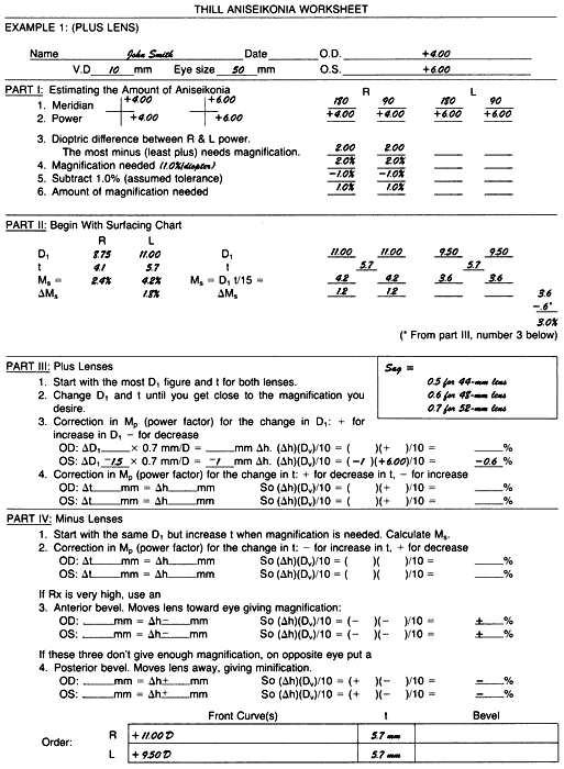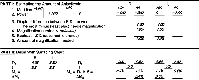Line 4: Gross magnification required. The figure from line 3 is multiplied by 1% per diopter. If some test was used for aniseikonia and a percentage was found, skip lines 1, 2, and 3; use the test figure on line 4.