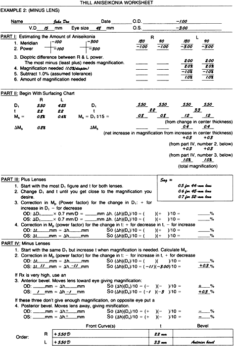Using the same directions given in the plus lens problem of Figure 2, fill out Part I of the Thill Aniseikonia Worksheet down to line 6, the amount of magnification needed, which in this example is 1% on the left eye.