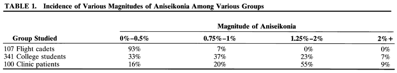 Gillott, in England, examined a cross section of a community and found 8% to have a significant aniseikonia, associated with symptoms.3 Ewalt, who used eikonometry for a lengthy period, suggested the clinically significant incidence to be about 2%.4 Duke-Elder said that some degree should be expected in 20% to 30% of people who wear spectacle correction.5
