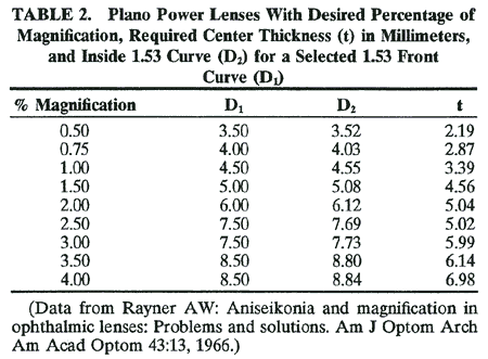 One way to determine if there is an aniseikonic condition without going to the expense of first ordering aniseikonic lenses would be to use special clip-on lenses that have magnification but no power. The configuration for these lenses might be as shown in Table 2, although there could be other combinations to attain the same results.17