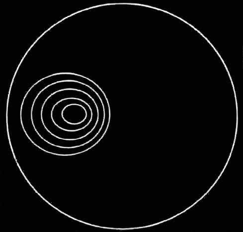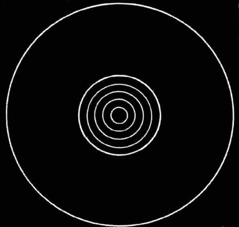 The simplest instrument for studying the corneal contour is a keratoscope, such as the Placido's disc (Fig 3), which consists of a circular target with alternate black and white annuli and a handle. Usually a +5.00-D lens is placed behind an aperture in the center of the disc to enable the examiner to see the image of the target produced by specular reflection from the smooth tear film overlying the cornea. The target, either illuminated indirectly or self-luminous, has an image formed of it by the cornea which is observed through the lens of the instrument. Figure 4 illustrates the appearance of the central corneal image of the target when there is no central astigmatism; the image consists of a series of successively larger circular white rings centered about the corneal apex. Figure 5 demonstrates the appearance of the image of the target as produced by the astigmatic periphery of the cornea. When the central cornea is astigmatic the images of the target rings are elliptic, with the long axis of each of the ellipses along the flatter meridian of the cornea.