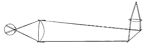 In use, the indirect ophthalmoscopy lens must be held at a distance in front of the entrance pupil of the eye approximately equal to the secondary focal distance of the lens. The aerial image of the fundus will then be at approximately the same distance on the opposite side of the lens in an emmetropic eye, closer to the lens in myopia, and farther from the eye in hyperopia (Fig 10).