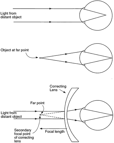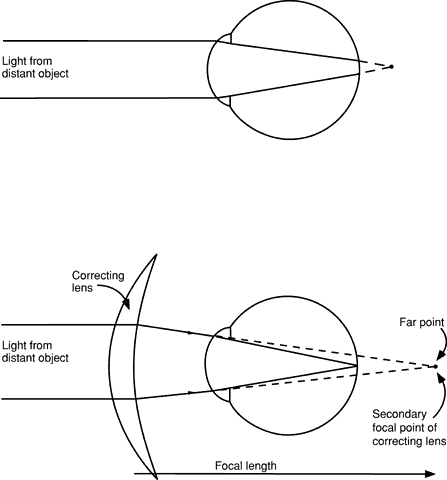 Fig. 1. Optical correction of myopia. Light from a distant object focuses in front of the retina of the uncorrected eye. For the image to fall on the retina, the object must be placed at the far point of the eye. Alternatively, a minus-power correcting lens may be placed in front of the eye to provide divergent light that simulates light coming from a near object. The secondary focal point of the correcting lens falls at the far point of the eye.