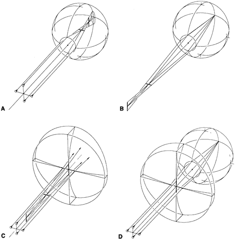 When a patient with astigmatism views a distant object point without accommodating, the point is imaged as two lines oriented 90 degrees apart (Fig. 3). In essence, the astigmatic eye has two different far points. (The astigmatism may be combined with either hyperopia or myopia.) Correction of the patient's refractive error now requires a lens that forms two different images, one at each of the far points. Such a lens has two different powers and is termed a spherocylinder, or toric, lens to distinguish it from a spherical, or sphere, lens, which corrects only myopia or hyperopia. With the proper spherocylinder lens in position, the distant point object can be focused as a single point image on the retina.