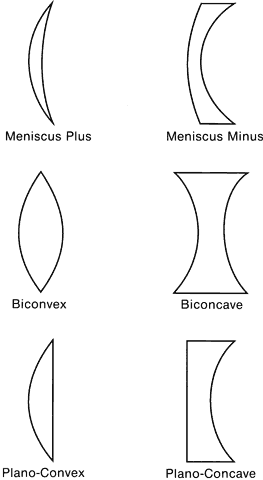 The power of a spectacle lens is obtained from a combination of the powers of its front and back surfaces. Each surface of a lens may be either convex, concave, or flat (plano or zero power), resulting in six general lens shapes (Fig. 4). Spectacle lenses used to correct refractive errors are almost always meniscus lenses, with both lens surfaces concave toward the eye. Plano-concave and biconcave shapes are used only for high minus power lenses. Biconvex and planoconvex shapes are not used for spectacle lenses because of their poor off-axis optical quality when mounted in a spectacle frame. However, with proper design and the use of aspheric surfaces, these lenses are useful as, for example, magnifying lenses (low-vision aids) and ophthalmoscopy lenses.