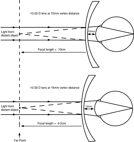where fV is the back vertex focal length of the refracting lens and d is the difference in vertex distance of the two lenses, with both distances measured in meters. If the spectacle lens is fitted forward of the position of the refractor lens (at a longer vertex distance than that of the refractor lens), then d is positive. If the spectacle lens is closer to the eye than the refractor lens, d is negative. Figure 5 provides an example. A refraction has been performed on a patient, and a power of -10.00 D is found with the refractor at a vertex distance of 10 mm. This lens has a back vertex focal length of -10 cm, so the patient's far point is 10 cm in front of the lens back surface. If the patient will be wearing spectacles that position the lens at a vertex distance of 15 mm, the distance, d, is + 5 mm, and the spectacle lens power needed is 1/(-0.10 + 0.005), or -10.53 D (-10.50 D when rounded to the nearest 0.25 D).