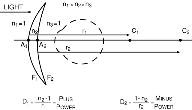 where D is the surface power in diopters, n1 is the index of refraction of the medium containing the incident light, n2 is the index of the medium containing the refracted light, and r is the radius of curvature of the surface, specified as the distance from the surface to its center of curvature, measured in meters. A sign convention similar to that used for focal lengths must be used for radii, and an example is shown in Figure 6. With light traveling from left to right, the distances ÜobA1C1 and ÜobA2C2 are both positive. The index of the lens is always greater than 1, so the front surface power (D1) is positive and the back surface power (D2) is negative, the typical surface power relationship for most spectacle lenses.