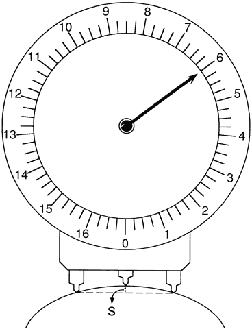 Lens surface powers are measured using a lens clock or lens measure (Fig. 8). When placed against a curved surface, the middle of the three lens clock pegs moves up or down, measuring the sagittal depth of the curve delineated by the two outer pegs. The radius of curvature of the surface is directly related to the sagittal depth. Surface power then is calculated using equation 3. Equation 3 requires that a value for the index of refraction of the lens be chosen, and the value used for all lens clocks is 1.53. Although no lens materials currently available have an index of 1.53, lens clocks are useful in checking and identifying lenses because in the optical industry, the 1.53 values are considered standard.