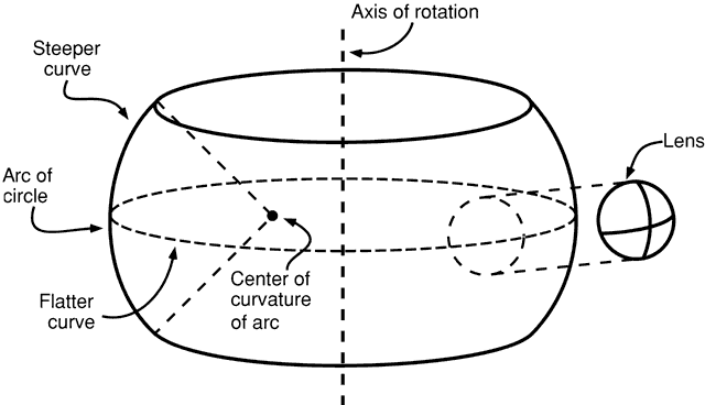 Spherocylinder, or toric, lenses, used to correct astigmatism, have two different powers, one for each principal meridian. These lenses have one spherical surface and one toroidal surface. A toroidal surface has different radii of curvature or different powers in different meridians, with the meridians of maximum and minimum power corresponding to the principal meridians of the lens. The shape of a toroidal surface can be thought of geometrically as the surface obtained by rotating an arc of a circle about an axis (Fig. 9). Depending on the radius of the arc, the figure has somewhat the shape of an automobile tire, a doughnut, or a barrel.