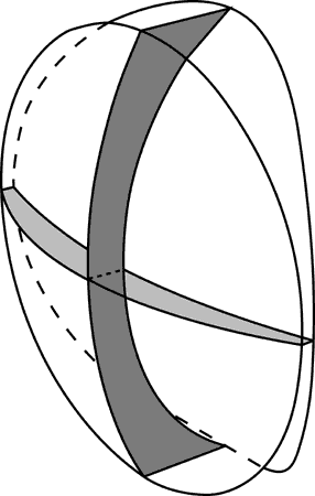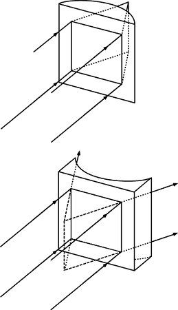Fig. 10. The cross-sectional shapes of the two principal meridians of a spherocylinder lens are different. Each principal meridian can have either a plus power or a minus power.