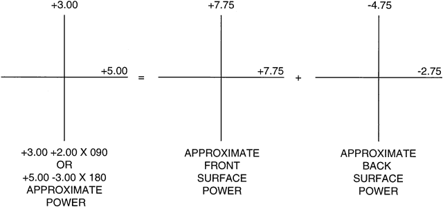 Figure 13 illustrates, using optical crosses, the surface powers used to make a minus cylinder design lens of power + 3.00 + 2.00 × 090, or + 5.00 -2.00 × 180. The lens has a base curve of + 7.75 D. Many possible combinations of surface powers exist that provide the proper lens power. The surface powers chosen by a lens designer are usually those that provide a lens with the sharpest image across the patient's field of view.
