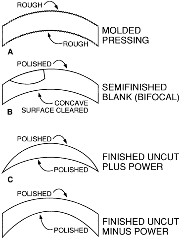 Finished lenses or finished “uncut” lenses have had both surfaces ground to the final optical quality (see Figs. 14C and D). The steps are the same as those described previously, except that thinner pressings or molds can be used because the lens power will not be further modified. The savings in lens material and the lower labor costs of mass production make this a less expensive route than semifinished blanks for popular single-vision prescription items. However, even in this procedure there are economic reasons for using a limited number of surface powers and molds. The uncut single-vision lenses provided by a lens manufacturer should be similar to those made by an optical laboratory from semifinished blanks of the same manufacturer. This provides consistent patient response.