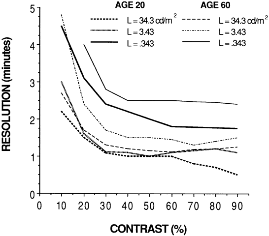 object contrast.1,2 Visual acuity variations also may be perceptual in origin. We sometimes think we “see” an object when we actually do not because we may function by recognition rather than by identification or visual acuity. For example, the letter A can often be recognized under conditions of poor visibility because it has the shape of a triangle. C, O, and Q may be more difficult to differentiate because of the similarities in shape. A street name may be recognized by its length. Thus, reading “acuity” is possible without resolution of the detail. When navigating in familiar territory under adverse conditions, we tend to navigate by recognition of landmarks rather than by reading signs or actually seeing low-contrast detail, such as a curb or a raised traffic island. However, where surroundings are not familiar or where unexpected objects may be in our path, good visual acuity becomes essential. If we are on a strange expressway, we must be able to read the signs. If we are approaching an unlit object, we must be able to resolve it from a dark background. Detecting a large object requires good differentiation of its edges, which is a critical visual acuity task. Once the depth of focus is exceeded, a refractive error degrades visual acuity. Each 0.25-D step of myopic refractive error (outside the depth of focus) decreases visual acuity by approximately one line on a Snellen chart,3,4 up to about 20/100 visual acuity, when chart step sizes become large. Hyperopic errors have much less effect because accommodation can compensate for the error. The effect of an astigmatic refractive error is approximately 80% of a myopic error of the same magnitude.3,4 The off-axis aberrations of a spectacle lens create power errors that have the same effects on acuity as spherical or astigmatic refractive errors. The importance of small refractive errors and the need for precise refractive correction were emphasized by Allen,5 who measured automobile braking distance when approaching an unlit vehicle in the presence of a glare source. Available braking distance was reduced by 1 foot for each 0.01 D of myopic refractive error (100 ft/D). Low light levels and poor contrast also decrease visual acuity, and the effects are much worse for older patients (Fig. 2). Only young patients can achieve 20/20 (6/6) visual acuity at low light levels. At the highest (best) acuity levels, the average 60-year-old subject needs 10 times more light or 2 to 3 times more contrast than the average 20-year-old to see the same objects.6–8 Even young subjects need at least 30% contrast to resolve 20/20 objects. Older subjects need at least 40% contrast to see 20/30 (6/9) targets.7 Thus, proper lens design and precise refraction are particularly important when luminance and contrast are low and where resolution of objects rather than recognition is necessary. Some of the most challenging visual situations occur during night driving or in bad weather because of the prevailing low luminance and low contrast. Driving while facing a low sun and reading backlit signs or identifying roadside detail is also difficult. The writing on a chalky blackboard can be a low-contrast, low-luminance situation, as can some sports activities. Permitting a preventable refractive error or allowing off-axis lens aberrations further lowers the contrast of a patient's visual world and makes these situations even more difficult. Maximizing contrast requires a precise refraction and proper choice of lens parameters, especially base curve. Most patients are sensitive to 0.25-D changes in lens power, and some can differentiate 0.12 (1/8)-D changes in lens power. The American National Standards Institute (ANSI) Z80.1-1995 dress ophthalmic lens standards allow an error of 0.12 D in the manufacture of most prescriptions,9 so errors of up to 0.12 D are not uncommon at the center of a lens. Even with optimum design, off-axis errors will be present. The ophthalmologist or optometrist can minimize errors by fine-tuning the refraction to the nearest 0.25 D, and, if necessary, to the nearest 0.12 D. The last judgmental step should be in the minus power direction to allow the patient to use accommodation to compensate for any residual error. A low-contrast visual acuity test target, which increases the sensitivity to refractive errors, may allow a prescription to be fine-tuned for difficult seeing situations. Night myopia may contribute to night-driving problems. At low light levels, the accommodative state of the eye can go to a “rest position,” focusing the eye for some intermediate distance other than infinity and making the eye effectively myopic.10 However, signs and lights often provide enough of an accommodative stimulus so that night myopia is not a problem. To prescribe for suspected night myopia, it may be necessary to provide the patient with trial lenses. The patient should be a passenger in a car driven at night and should test the appropriateness of the trial lenses before a prescription is finalized. |