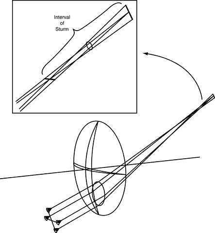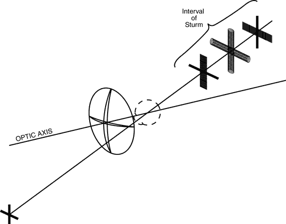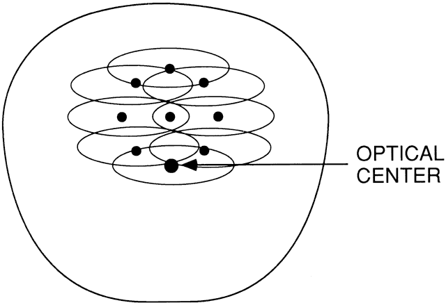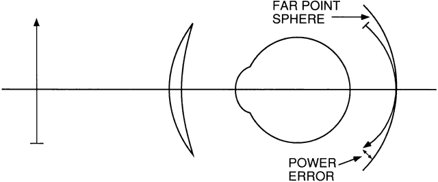 THE FAR-POINT SPHERE A patient's refractive error is corrected when the image of a distant object formed by the correcting lens falls at the patient's far point. When the patient rotates his or her eyes to use various portions of the lens, the far point also moves, tracing out a surface known as the far-point sphere. The goal of the lens design process is to cause images of off-axis objects to fall on the far-point sphere. To accomplish this goal, off-axis lens aberrations must be reduced to minimum levels. LENS ABERRATIONS (FIELD-OF-VIEW ERRORS) Of the seven commonly described lens aberrations,11 four—radial or oblique astigmatism, curvature of field (power error), distortion, and transverse chromatic aberration (lateral color)—significantly degrade vision through off-center areas of a spectacle lens. These aberrations decrease the useful field of view through a lens and may be termed field-of-view errors. The magnification effects of lenses and the difference between the magnifications of the two lenses are also factors in the design.The goal of the lens design process can be restated as an attempt to maximize the useful field of view through a lens. The other three aberrations—spherical aberration, coma, and longitudinal chromatic aberration—have little effect on vision through spectacle lenses, although they can be of importance in the design of other types of lenses. When a patient turns his or her eye to look at a point object that is not along the optic axis of a spectacle lens, the image of the point formed by the lens may no longer be a point. Instead, the point may be imaged as two lines (line foci) perpendicular to each other, with one line closer than the other to the lens (Fig. 3). This aberration of the image is radial or oblique astigmatism. The effects of radial astigmatism on image formation are similar to that of astigmatism in general. If one of the line images falls on the far-point sphere, the patient sees the image of the point as a line. If the two foci straddle the far-point sphere, no sharp image is formed. Instead, the image appears round and blurry (a blur circle). At other positions of the line images relative to the far-point sphere, the image formed is blurry and elliptical in shape. The separation of the two line foci formed by radial astigmatism is termed Sturm's interval, and the out-of-focus circular image formed between the two line foci is known as the circle of least confusion.12 If an extended (large) object is viewed off-axis through a lens that has radial astigmatism, then each point on the object is imaged as two line foci at different distances from the lens. In the example in Figure 4, the vertical arms of the cross-object are imaged as a large number of short horizontal lines at the focus closer to the lens. The horizontal arms of the cross are also imaged as a large number of short horizontal lines, but the line images overlap along the length of the arms. If this image were to be formed at the far-point sphere of a patient's eye, the patient would see the horizontal arms of the cross in sharp focus, but the vertical arms would appear blurry. At the focus farther from the lens, the situation is reversed, with the vertical cross-arm in sharp focus and the horizontal arm out of focus. At the circle of least confusion, all points on the cross are imaged as out-of-focus circles, and both arms of the cross appear equally blurry. The appearance of the image differs at different distances from the lens.
