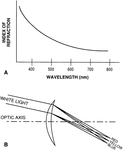A standard terminology describes the foci created by radial astigmatism. Suppose a patient were to look laterally away from the center of a lens at a cross target. If the patient's field of view is considered to be a circle on a vertical plane, with the cross pattern at the lateral edge of this circle, then the vertical arms of the cross are tangent to this circle. The focus of the vertical arms by the lens is termed the tangential focus, and errors in their focus position relative to the far point sphere are tangential errors. Errors in focus that affect the cross arms perpendicular to the tangential detail (i.e., the horizontal cross-arms) are termed sagittal errors, and the focus of these lines is called the sagittal focus. If the patient were to look upward at a cross at the top of the field of view, the horizontal cross-arms would be tangential to the field-of-view circle, the focus of the horizontal cross-arms would be the tangential focus, and the vertical cross-arms would be imaged to form the sagittal focus. Tangential and sagittal focus errors increase as the distance from the center of a lens increases. The two foci formed by a lens with radial astigmatism may be in front of the far-point sphere or behind the far-point sphere, or they may straddle the far-point sphere. The average dioptric value of the two focus positions specified relative to the zero value of the far-point sphere is termed power error. Power error increases as the distance from the optic axis of a lens increases, and the image surface for an extended object is curved, resulting in curvature of field (Fig. 5). Generally, power error and radial astigmatism cannot be eliminated at the same time.13 When radial astigmatism is eliminated, there will be some residual power error, and when power error is eliminated, some radial astigmatism will still be present (Fig. 6). Rather than attempt to correct power error directly, lens designers may try to minimize individual sagittal or tangential focus errors. A sagittal or tangential focus position behind the far-point sphere (negative error) probably has less effect on visual acuity than a focus position in front of the far-point sphere (positive error) because a patient can accommodate and pull the negative focus forward onto the retina. Therefore, perfect balancing of the sagittal and tangential errors, one in front of and one behind the far-point sphere, may not provide optimal off-axis image quality. Correction of a positive error with larger tolerances for negative errors may be the best strategy. Which aberration, radial astigmatism or power error, is more important to correct? This question has been the source of considerable discussion and argument in the optical industry for years,14 and the discussion continues. Most current lens designs compromise, attempting to minimize both aberrations without completely correcting either. This topic is discussed more fully in the section on the evolution of lens design. Transverse chromatic aberration, or lateral color, is caused by dispersion, the variation of refractive index with wavelength that occurs for all spectacle lens materials (Fig. 7A). When a patient looks laterally to view a point object through a lens, the different wavelengths of light from the object each are refracted differently, “smearing” the image into its component colors (see Fig. 7B). If the object is not a point, but instead a large object such as a cross, the effects of dispersion are not the same. Each wavelength of light from the vertical arms of the cross is refracted differently, resulting in color fringes that surround the image of the vertical arms. However, the image of the horizontal cross-arms is relatively unaffected because the dispersion of the light into its component colors occurs along the arms of the cross and is not noticeable except at the cross-ends. Therefore, it can be argued that the effects of transverse chromatic aberration may be more important for the tangential focus than for the sagittal focus. The effect of transverse chromatic aberration is analogous to the dispersive effects visible when looking through a prism. The prismatic effects of a lens vary with the lens power and with the distance from the lens optical center that a light ray passes through the lens. The relationship is termed Prentice's rule15: P = h × D (1) where P is the prism obtained in prism diopters, h is the distance from the lens optical center measured in centimeters, and D is the lens power in diopters. Prismatic effects are larger for higher-power lenses and larger angles of view, so transverse chromatic aberration, which is related to the prismatic effects of a lens, will be worse for these same conditions. High-index glass and high-index plastic lens materials have more dispersion than crown glass or CR-39 plastic, and the problems of transverse chromatic aberration are more important for lenses made of these materials. Clinically, patients report color fringes around objects only when looking away from the center of these high-power, high-index lenses, but it is unusual for patients to report color fringes when their lens powers are less than approximately 5.00 D. The lens designer cannot vary the dispersion of a given material, so in a sense, nothing can be done about transverse chromatic aberration. However, proper lens design to minimize or eliminate other aberrations and proper fitting techniques in the optical dispensary can minimize the total off-axis blur and improve visual acuity. Distortion is a lens aberration caused by the variation in magnification from the center to the edge of a lens (Fig. 8). It has little effect on resolution of an image, but it does affect the shape of the image. When an extended object is imaged by a high-minus power lens that has decreasing magnification toward the lens periphery, the images of portions of the object farther from the lens center are magnified less than those closer to the center, resul