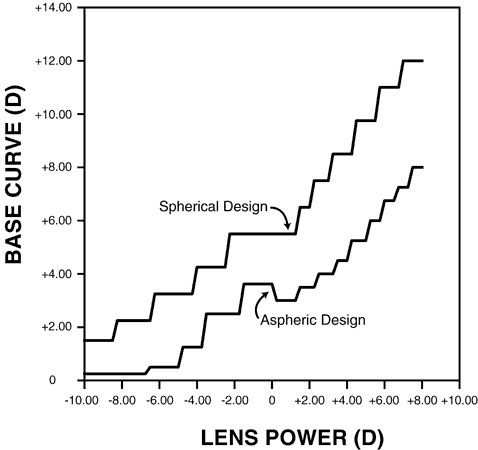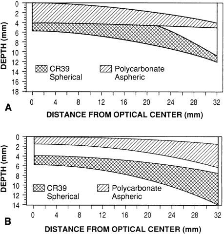 The primary difference between aspheric and nonaspheric lens designs is that the front surfaces of aspheric designs are flatter. Front surface curves of nonaspheric lens series must be relatively steep to provide good off-axis vision. Steep curves make for a bulky-looking, thick lens and increase magnification. This magnification causes “image swim” when a patient first receives new glasses and also makes the patient's eyes look unnaturally large. For a given prescription, using a more shallow (flatter) spherical base curve allows the use of thinner lenses and decrease magnification, but the decrease in curvature also reduces the patient's clear field of view by increasing off-axis aberrations. The solution to this problem is to use an aspheric front curve (base curve) on the lens. This aspheric front curve is much flatter (lower power) than the spherical front curve required for a nonaspheric lens of the same power (Fig. 14). For example, a polycarbonate lens of power + 4.00 D, which normally would have a spherical base curve of + 8.50 D, can be made in aspheric form with a front curve of + 4.50 D. A spherical design polycarbonate lens of power -6.00 D that has a spherical base curve of + 3.25 D can be made in aspheric form with a base curve of + 0.50 D. The base curves chosen for aspheric lens designs vary from manufacturer to manufacturer. Some designs have steeper base curves than others, but all have base curves that are flatter than those used for spherical designs. The aspheric polycarbonate lens series shown in Figure 14 is one of the flattest available.