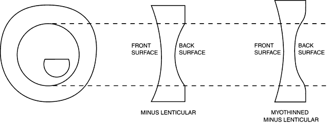 multiple ring reflections (myopic rings) near the lens edges. High-minus power lenses are occasionally made in lenticular form (Fig. 17). In essence, the thick edge is removed at the lens back surface, creating a peripheral carrier that has no optical function and a central bowl about 40 mm in diameter that provides the refractive correction. When the lens front surface is flat and the carrier also has a flat back surface, the lens is often termed a myodisk. The junction of the carrier and bowl of a minus lenticular lens can be blended to decrease its visibility and to eliminate the sharp edge. The process used is commonly termed myothinning (see Fig. 17). All high-minus power lens designs must be used with care because of their poor cosmetic appearance.