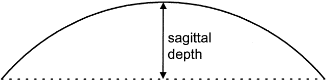 LENS TYPES AND PARAMETERS Lenses either are soft or hard. Soft contact lenses (SCLs) are “all alike” because they are made from hydrogels, water-containing soft material. Rigid lenses currently are made from RGP materials; the “old” hard lenses were made of PMMA, a plastic that was not oxygen permeable. All contact lenses share the same important parameters: diameter, central posterior curve (CPC—also known as base curve, or BC), and power (Fig. 6). Diameter is measured in millimeters, CPC is measured in diopters (for rigid lenses) and millimeters (for SCLs), and power is measured in diopters. Diameter and CPC determine the sagittal depth of a lens (Fig. 7). No one has proven a numerical relationship between sagittal depth and lens fit, but most practitioners believe that an increase in sagittal depth for either a soft or rigid lens results in a more tightly fitting lens.10–13 Thus, the lens itself tightens as the sagittal depth increases. Increasing the diameter of a lens increases the sagittal depth to a great degree and also results in tight fitting.