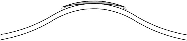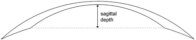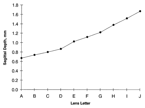 Because these lenses are fitted strictly from a diagnostic set and calibrated by sagittal depth (Fig. 20), the CPC and diameter of the dispensed lens are taken from the properly fitting diagnostic lens itself. Therefore, the only calculation necessary is the power of the lens. This calculation is performed similarly to the method for standard rigid lens fitting. Note, however, how the CPC is expressed for this type of lens: central curve/peripheral curve, for example, 54.00/45.00 D. Example A keratoconus patient desires contact lens fitting. A diagnostic lens of CPC 52.00/45.00 D and power of -16.50 D was tried on the patient, and the overrefraction was found to be -3.00 D. A lens of CPC 56.00/45.00 D next was tried, and this lens fit better, as the first lens bore on the cone. Thus, the following calculation was performed: