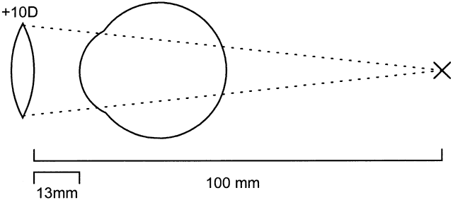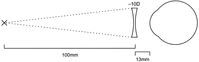 In the second example, the -10 lens has the same focal length (100 mm), but in the opposite direction (Fig. 11). When it is placed onto the eye as a contact lens, the focal length increases: 100 + 13 = 113 mm. Thus, the contact lens has a power of (1000/113) -8.87 D (rounded to nearest eighth of a diopter).