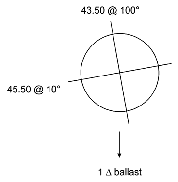 Thus, the spherocylinder lens power (uncorrected for rotation) was + 0.75 - 1.00 × 10°. Because the diagnostic lens rotated one and a half clock hours to the right, 45° was subtracted from the axis of the astigmatism (10° + 180° - 45° = 145°). Therefore, the final lens power was + 0.75 - 1.00 D × 145°. Comments Make sure the diagnostic lens set is made from an RGP material and is manufactured by the same laboratory that will make the final lens. The newer high Dk gas-permeable materials are lighter than PMMA and may rotate differently than PMMA, so an RGP fitting set is required. Prism ballast typically comes in 0.75Δ, 1.5Δ, and 2.5 Δ; 1.5 Δ is the amount usually used in this type of lens. BITORIC WITH PRISM Indications The rare patient presents with moderate corneal astigmatism and moderate lenticular or residual astigmatism. This patient manifests the following dilemmas: