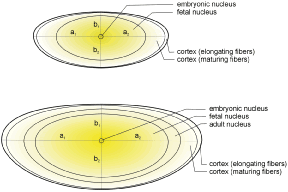 *Measurements of fiber cross-sectional size were taken from thick sections through the equatorial plane. †The number of years required to form each region corresponds to accepted periods of development (primary and secondary fiber formation during fetal development), growth (infancy and childhood), and aging (beyond puberty). ‡Thickness × width of an average fiber. §Diameter of an average equivalent circular cell perimeter. (Adapted from Taylor VI, Al-Ghoul KJ, Lane CW et al: Morphology of the normal human lens. Invest Ophthalmol Vis Sci 37:1396, 1996.)