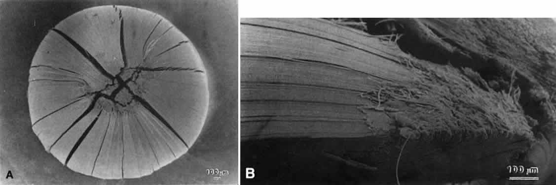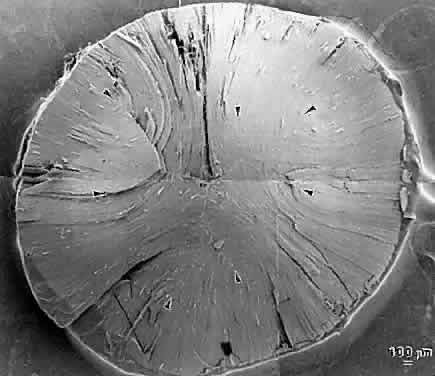 The first generation of sutures in cortical cataracts has normal Y patterns. However, examination of cortical cataracts removed from patients in the fourth through fifth decades reveal that the second through fourth generations of sutures failed to form normally (Fig. 5). In concentric growth shells, radially enlarging subbranches are formed in identical locations. As a result, continuous suture planes, in the shape of cones extending from the periphery to the pole, are formed over a period of 3 decades, beginning shortly after birth.