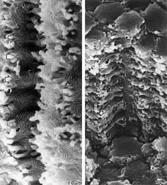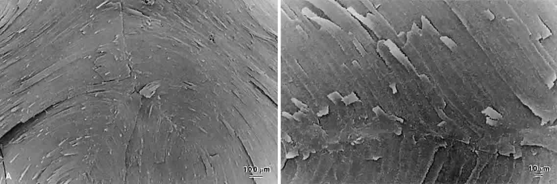 Fig. 13. SEM micrographs of embryonic nuclear fibers from aged transparent 57-year-old lens (A) and from a 77-year-old nuclear cataract (B). Interlocking edge processes (curved arrows), furrowed membrane domains (arrowheads), and anteroposterior fiber compaction (open arrows), resulting in accordion-like folds along the length of fibers, are apparent in both specimens. However, ongoing studies suggest that the anteroposterior compaction is quantifiably greater in nuclear cataract embryonic fibers than in aged embryonic nuclear fibers. (A, Taylor VL, Al-Ghoul KJ, Lane CW et al: Morphology of the normal human lens. Invest Ophthalmol Vis Sci 37:1396, 1996)