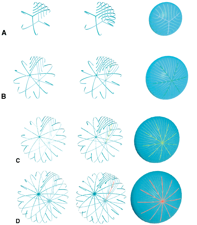 Fig. 4. A series of scale (approximately 3:1) three-dimensional computer-assisted drawings (3D-CADs) showing normal human lens sutural anatomy as a function of fetal development (A), infantile and juvenile growth (B and C) and adulthood (D). Throughout fetal development, six straight fibers are positioned precisely to divide growth shells into six equal segments. Three of the straight fibers, oriented at 120° to one another, have one end that extends to confluence at the anterior pole, whereas the other three comparably oriented straight fibers have one end that extends to confluence at the posterior pole. All other fibers in any shell are S-shaped fibers, or fibers with opposite end curvature. Between any two straight fibers, are groups of S-shaped fibers with progressively variable degrees of opposite end curvature. Neither end of an S-shaped fiber reaches a pole, and because of the variable degree of opposite end curvature, the anterior and posterior ends of these fibers become aligned as offset (60°), anterior, and posterior latitudinal arc lengths. The ends of S-shaped fibers in neighboring groups overlap precisely to form suture branches. Although the anterior ends of S-shaped fibers in neighboring groups overlap to form an anterior suture branch because of opposite-end curvature, the posterior ends of these same fibers do not overlap with one another to form a posterior suture branch. In the fetal nucleus, the anterior and posterior ends of S-shaped fibers from all neighboring groups overlap to form three anterior and three offset (60°) posterior branches arranged respectively as Y and as inverted Y suture patterns. The key parameters of the progressively more complex generations of human lens suture patterns formed throughout life are shown in the second through fourth rows. From birth through infancy, 12 groups of S-shaped fibers become symmetrically positioned between 12 straight fibers to form a simple star. From juvenile through sexual maturation, 18 groups of S-shaped fibers become symmetrically positioned between 18 straight fibers to form a star suture. Finally, throughout adulthood, 24 groups of S-shaped fibers become symmetrically positioned between 24 straight fibers to form a complex star suture. As more suture branches are formed as a function of development, growth, and age, the degree of opposite end curvature and variation in intrashell fiber length decreases.