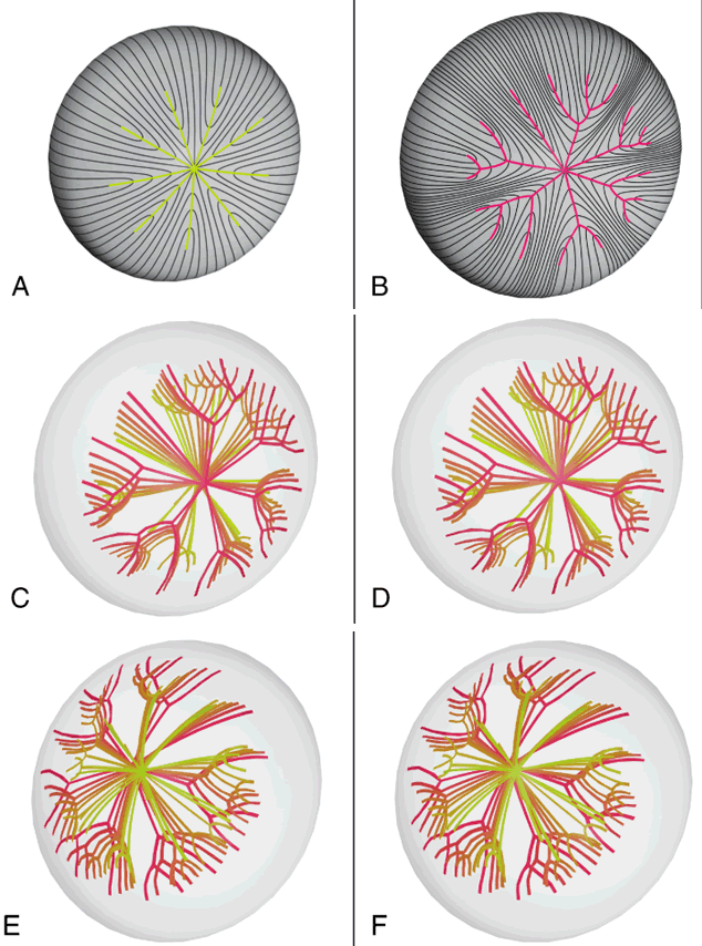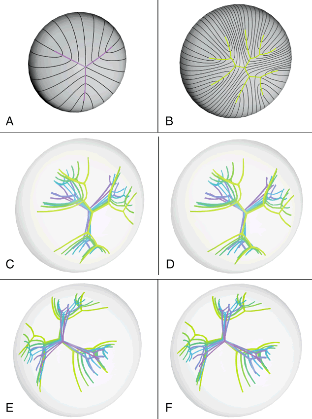 Fig. 5. Scale (3.5:1) schematic 3D-CADs depicting a normal human lens anterior suture pattern at birth (A) and an abnormal anterior suture pattern of a surgically removed (intracapsular technique) cortical cataract (37-year-old man; B). Because lens growth is inside-out throughout life, progressively younger to older growth shells can be removed to expose suture patterns formed during specific periods of development, growth, and age. The early cortical cataract had nine nonidentical and asymmetrically positioned suture subbranches extending from an irregular Y suture. By superimposing schematic 3D-CADs of suture patterns from representative growth shells extending from the adult nucleus to the superficial cortex in such a lens, the sutural anatomy of a cortical cataract lens can be reconstructed as it existed in situ from birth through the time of surgery. Stereo scale schematic 3D-CADs depicting the three-dimensional anterior (C and D) and posterior sutural anatomy (E and F) of the early cortical cataract shown in B. It can be seen clearly that abnormal suture formation, from birth through adulthood resulted in continuous abnormal suture planes of comparable shape (conical or cuneiform) and size (progressively larger as a function of depth or age), and in analogous locations as typical cortical opacities seen by slit-lamp biomicroscopy.