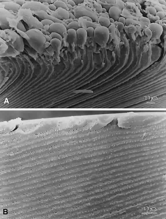 Fig. 8. Higher-magnification SEM micrographs of the RCS PSC shown in Figure 7. A. At this magnification, it can be seen that the PSC was the result of enlarged posterior ends of fibers turning up and away from the polar axis rather than overlapping within and between growth shells to form suture branches. It also can be seen that many of the posterior ends had blebbed off from the rest of the fibers. In any plane of section, these blebs would appear to be Wedl cells. B. A comparative view of posterior fiber ends beneath the posterior capsule of a normal adult rat lens.
